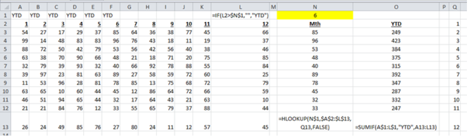 The formula in column O sums that row (columns A to L) for every column where "YTD" is found in row 1 for columns A to L.