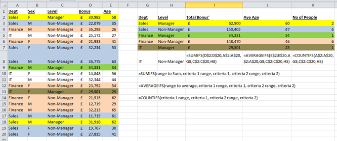 In the example below the data set in columns A to E are being summed in column I, averaged in column J and counted in column K, every time the criteria in column G is matched to column A, and the criteria in column H is matched to column C.